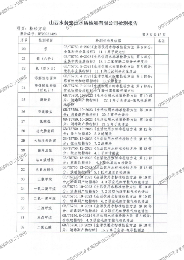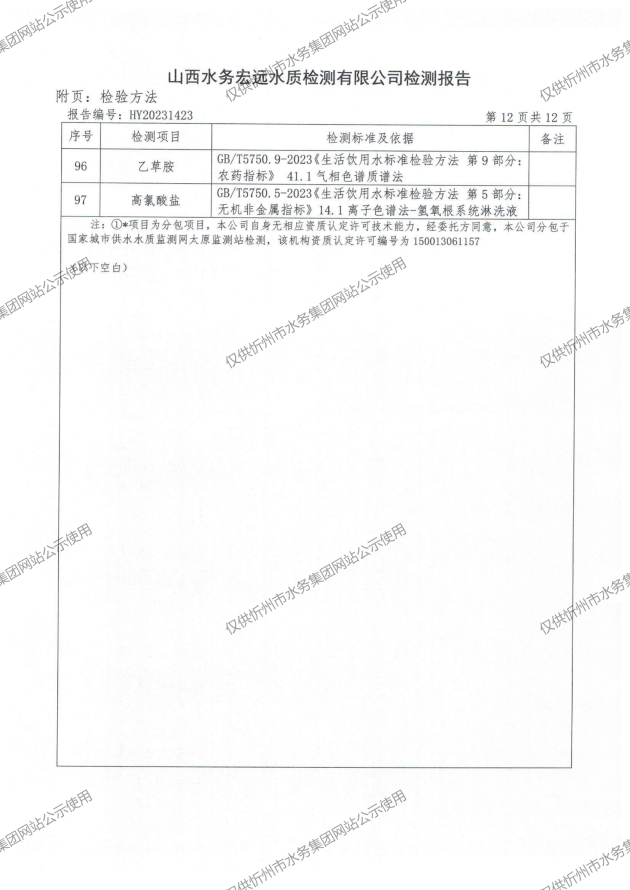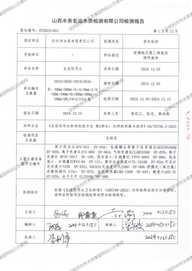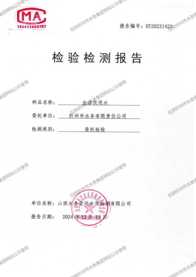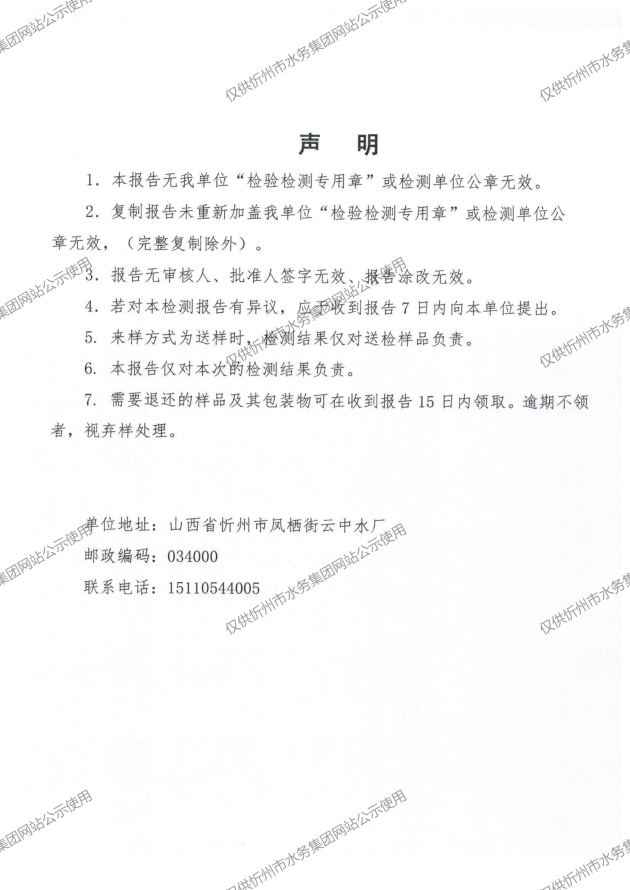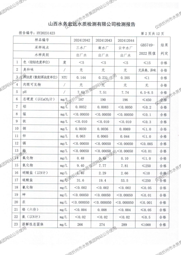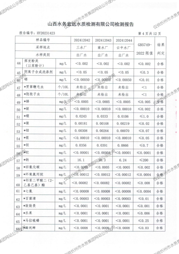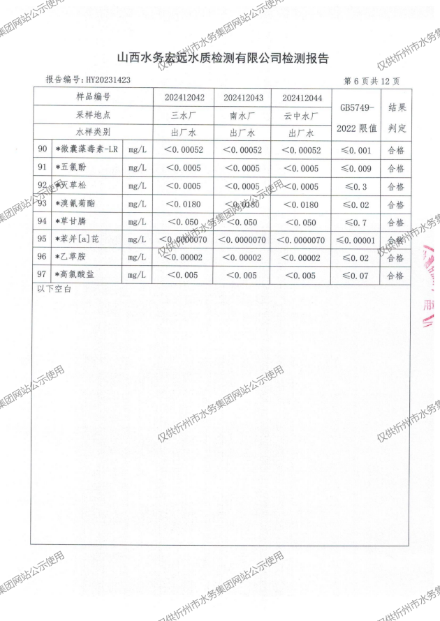2024年忻州城區(qū)公共供水南水廠、三水廠、云中水廠出廠水97項水質全分析