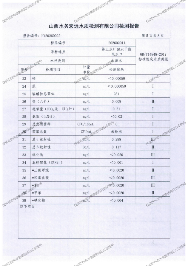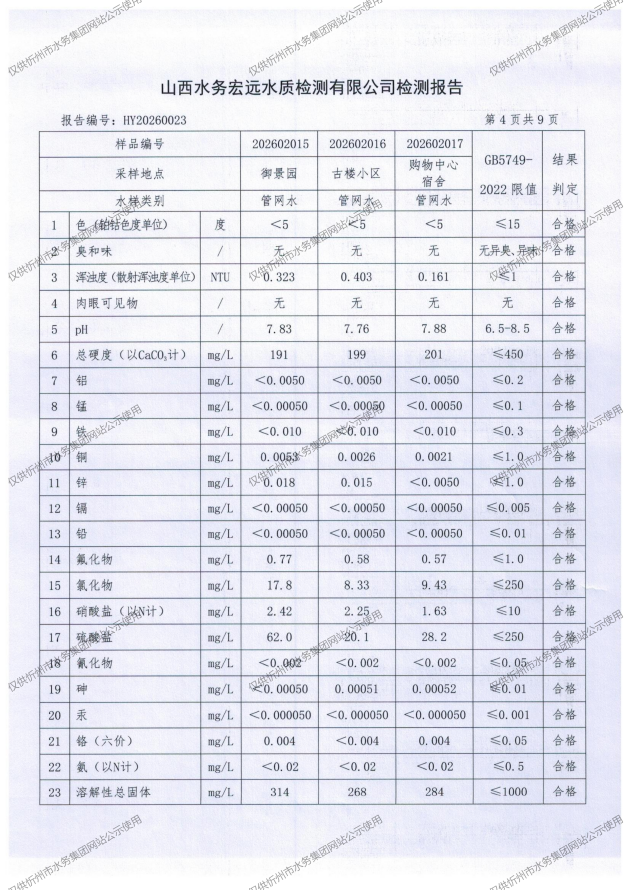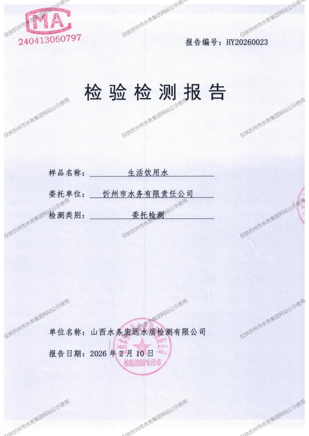 忻州城區(qū)公共供水水源水、出廠水、管網(wǎng)水、管網(wǎng)末梢水2026年2月份水質(zhì)信息公示