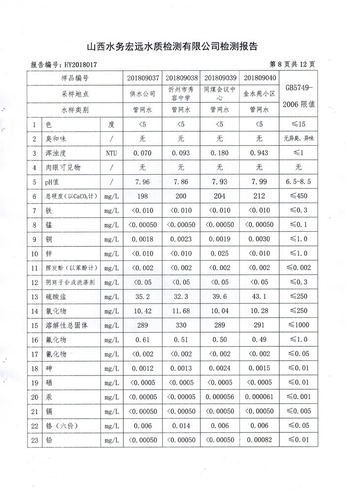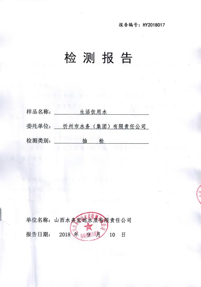 忻州城區(qū)公共供水水源水、出廠水、管網(wǎng)水、管網(wǎng)末梢水2018年9月份水質(zhì)信息公示