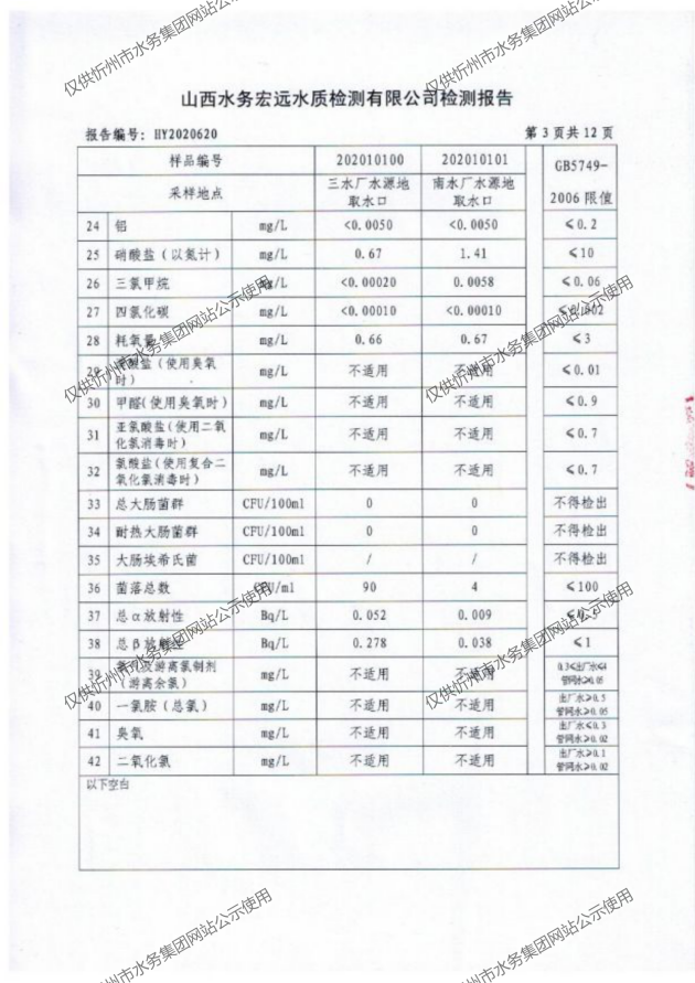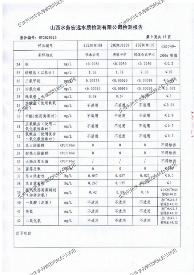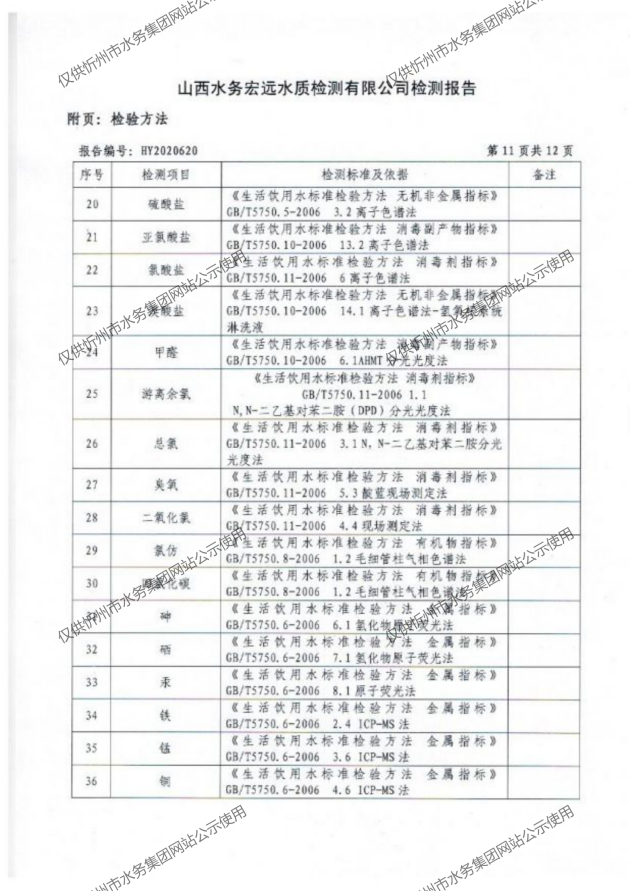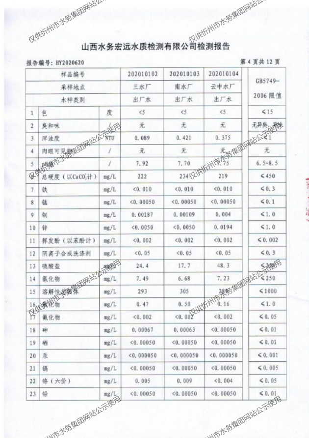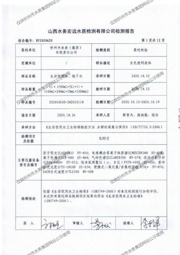 忻州城區(qū)公共供水水源水、出廠水、管網(wǎng)水、管網(wǎng)末梢水2020年10月份水質信息公示
