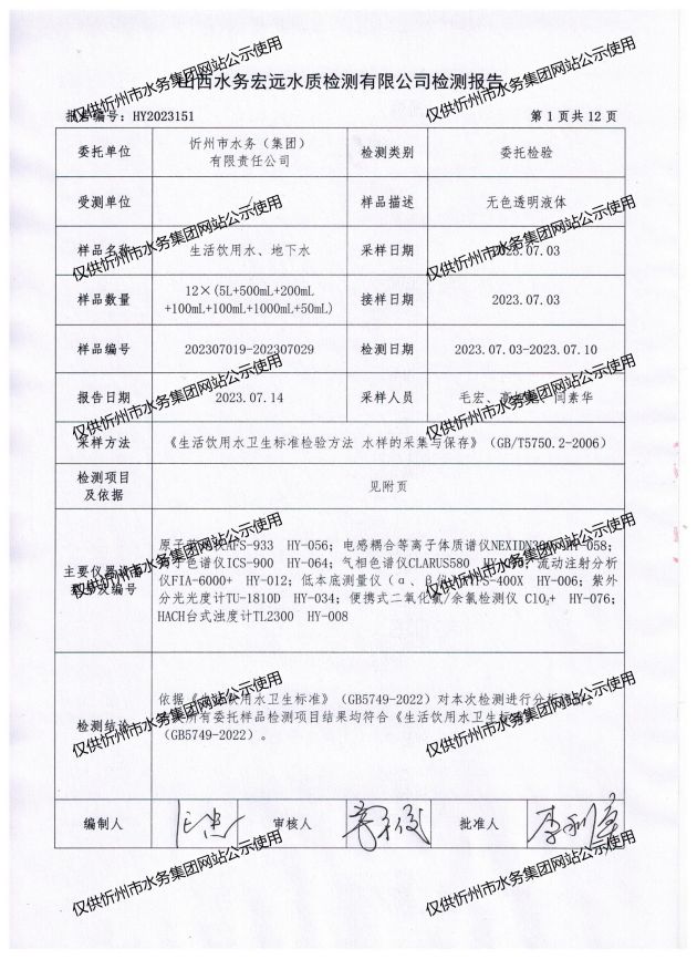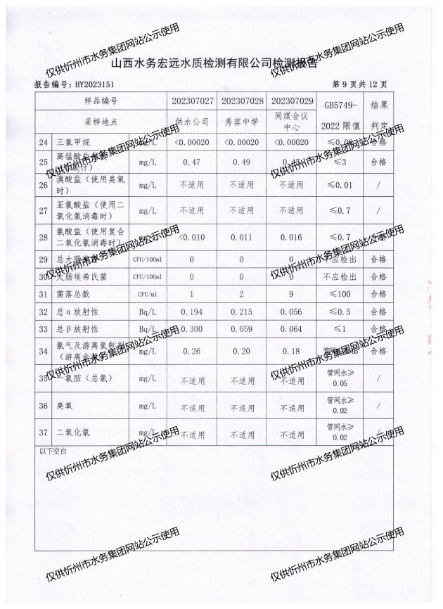 忻州城區(qū)公共供水水源水、出廠水、管網(wǎng)水、管網(wǎng)末梢水2023年7月份水質(zhì)信息公示